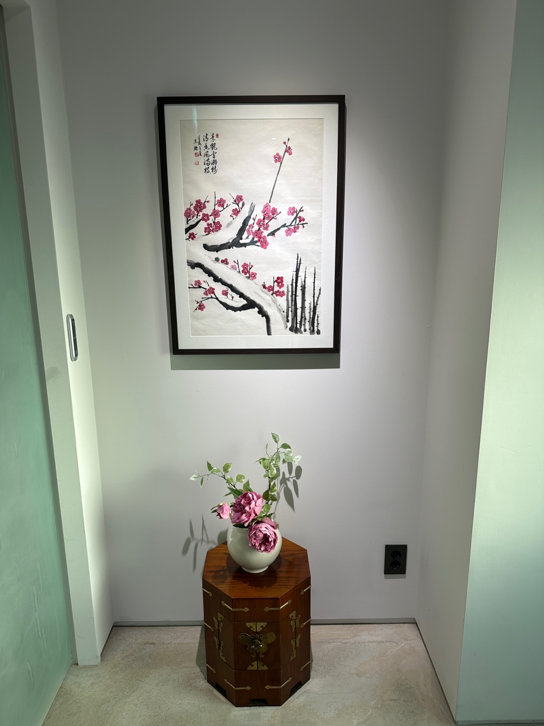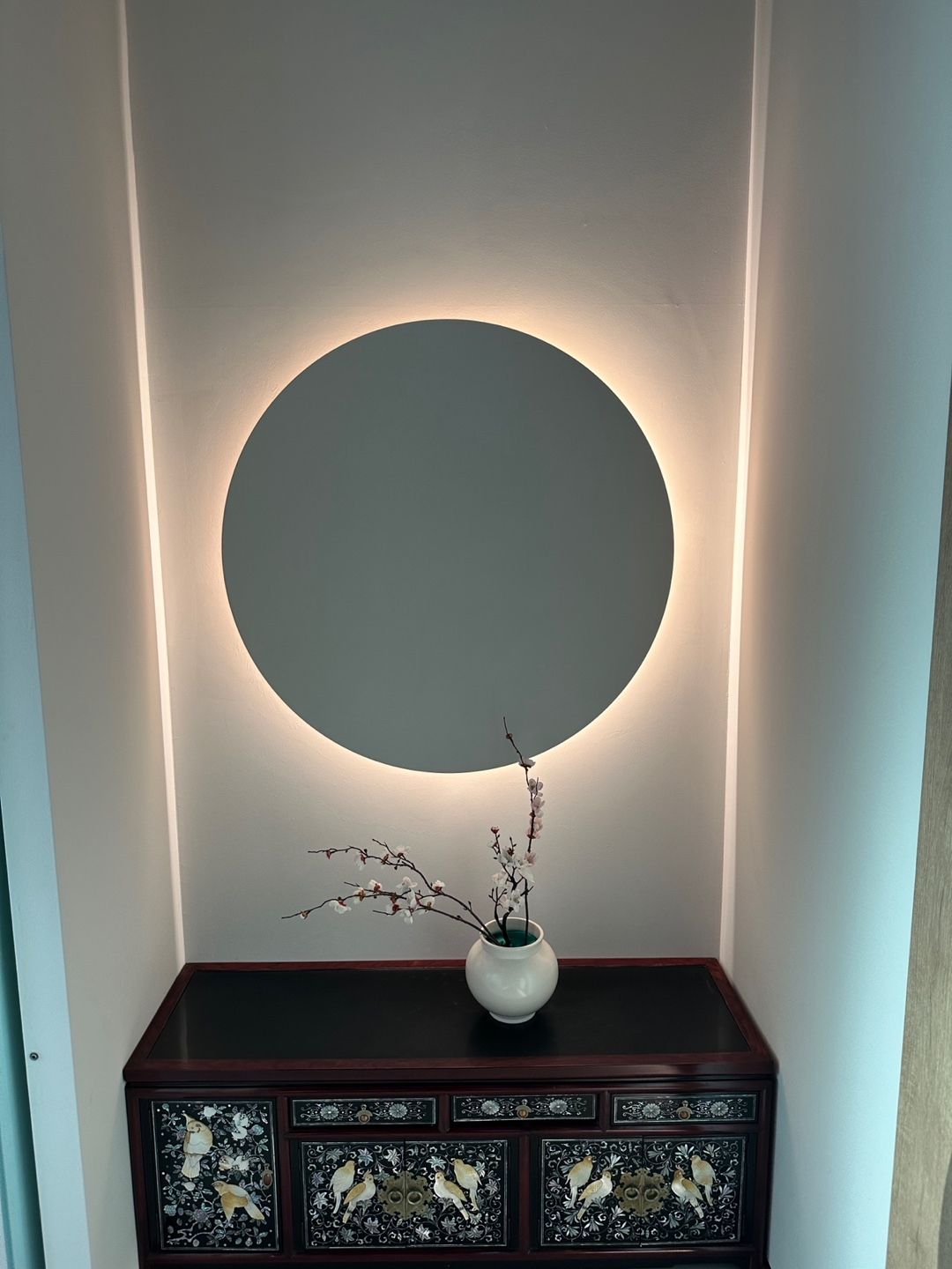 9.달 조명 앞에 장식장 위 먼지제거 및 조화 세팅 사진대로 세팅하기