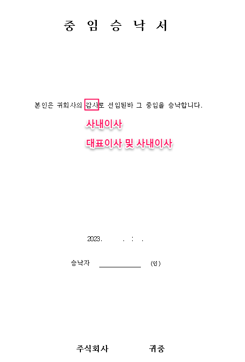 '본인은 귀 회사의 "대표이사 및 사내이사"로 선임된바 그 중임을 승낙합니다.'